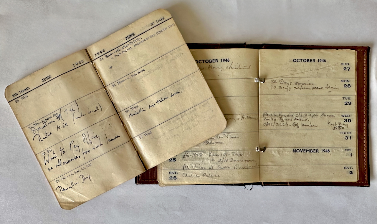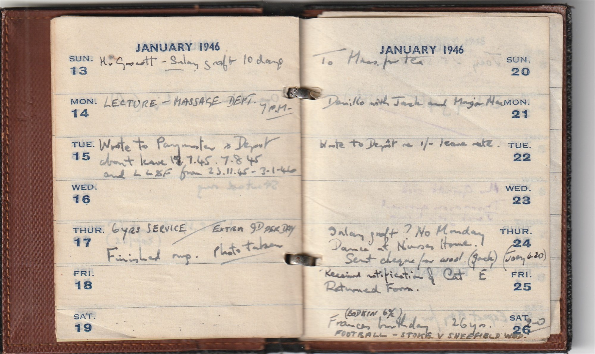 The two small, ordinary pocket diaries take us from Barletta, Italy in January 1945 until the end of discharge leave in November 1946. In them, he records not only the progress in his reconstructive journey, but also details of his trips out of hospital, his visitors and struggles with the Medical Board for official leave and pension.