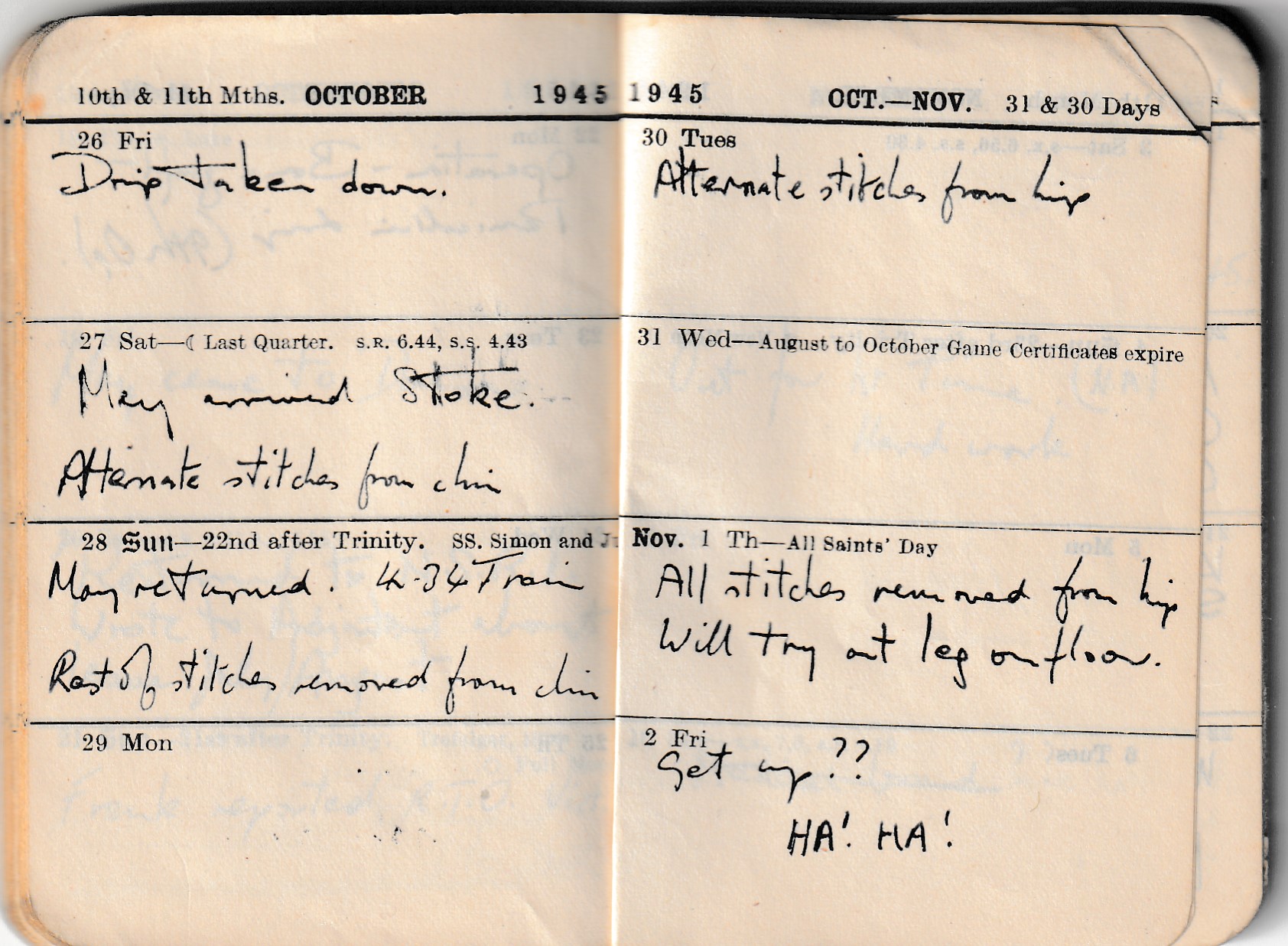 and occasionally the reactions of those close to him. 4th April 1945 “Joan turned up with Mother” he records, “what a situation!”. After his 9th operation, for a bone graft, on 22nd October 1945 he uncharacteristically records an emotional reaction when he makes these 3 entries; 1st November “All stitches removed from hip. Will try leg out on floor” followed by on 2nd November “Get Up?? HA! HA!” (figure 1), and finally more prosaically on 8th November “Out for first time (N.A.) Hard work.”  Throughout we get a sense of him just “getting on with” maintaining a daily routine despite long periods in hospital and his planning for a return to civilian life after treatment.